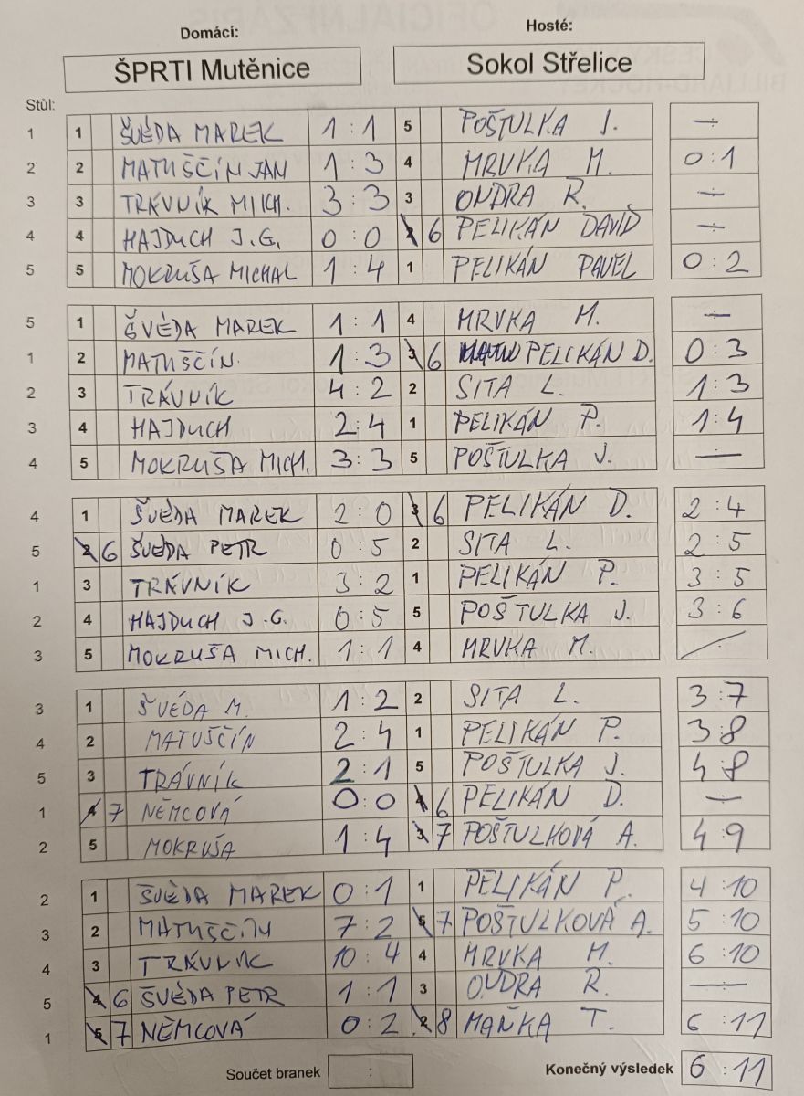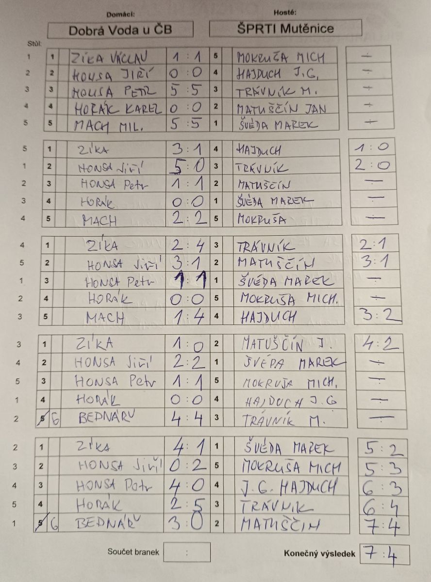 Po dvou výhrách v Mostě jsme plni očekávání pořádali druhé kolo 1. ligy. Přijeli od Českých Budějovic hráči Dobré Vody a posílení naši známí ze Střelic u Uničova. V prvním zápase si to rozdaly právě tyto dva týmy a podle předpokladů vyhrála Dobrá Voda. V pravé poledne nastoupilo našich sedm statečných s chutí urvat další body. Ovšem nepodařilo se chytit tempo. Výborný výkon podal snad jen Michal Trávník a to nestačilo. S vidinou naděje jsme vstoupili do dalšího utkání proti několikanásobným mistrům ČR, hráčům Dobré Vody. V první směně se tedy děly věci! Tři hráči drželi remízy a dva dokonce vedli o čtyři a o tři góly! No nestačilo to. Vedení neudrželi a bylo pět remíz po první směně. Těsné výsledky a drama pokračovalo i v dalších směnách, kdy se soupeř dostal do vedení 4:2 před poslední směnou. Tréňa ve snaze přidat týmu síly prohlásil, že pokud vyrovnáme stav utkání, zaplatí společnou večeři v místní pizzerii, ale ani to nepomohlo. Zkušený soupeř si výsledek pohlídal a my musíme získat body 6/6/2026 ve Žďáru nad Sázavou.