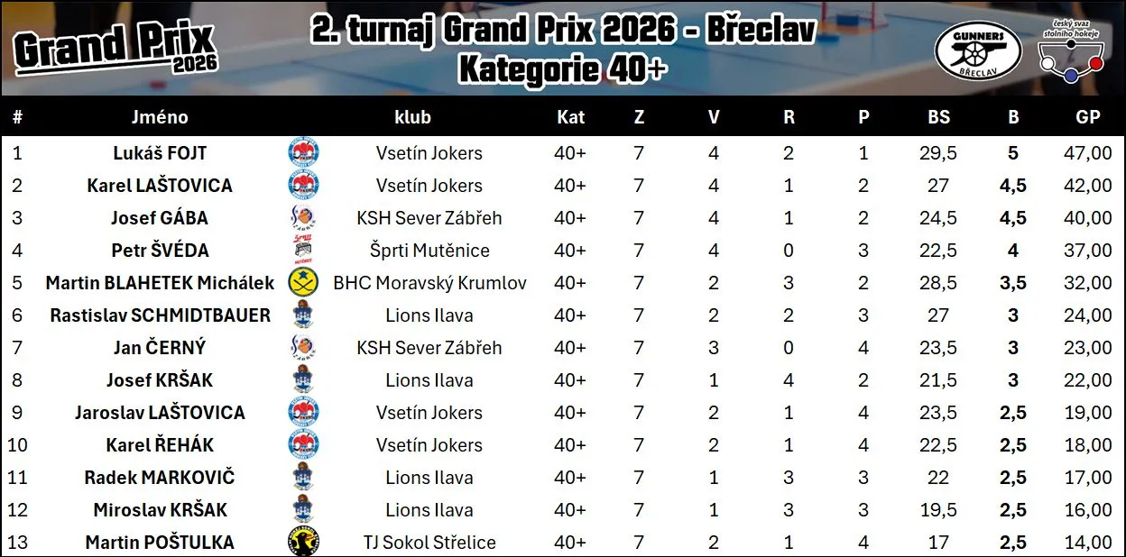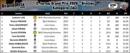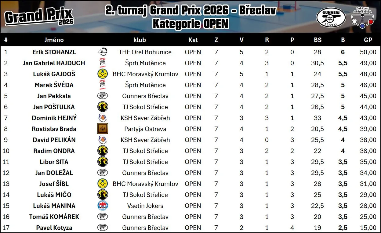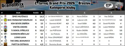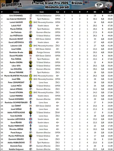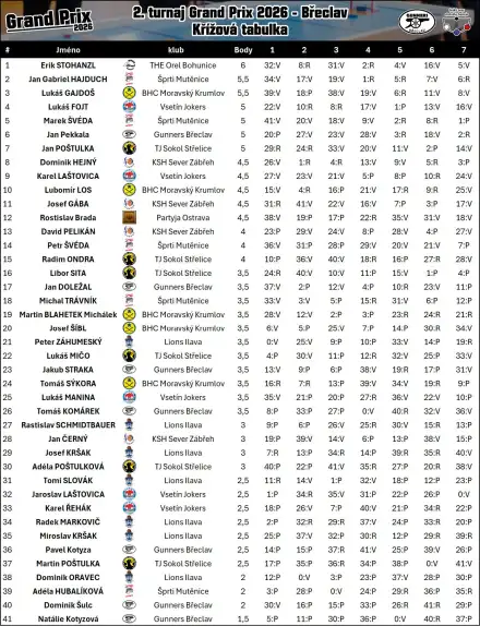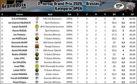 Dne 14.3.2026 se konal druhý turnaj série Grand Prix. Tentokrát se turnaj konal v Břeclavi a přijelo na něj krásných 41 hráčů a hráček z 9 klubů. V turnaji zvítězil Erik Stohanzl z klubu THE Orel…